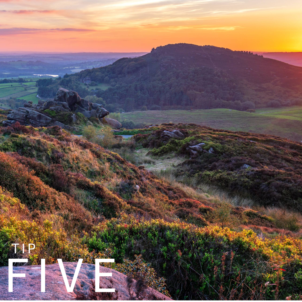 Take a local evening stroll around sunset and find the perfect place to capture the magic of the sun setting across the landscape.